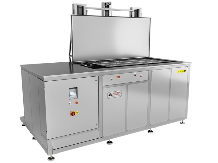 Ultraljud erbjuds som standard i 28 kHz eller 40 kHz och anpassas efter tankvolym och geometri. Maskinen har uppvärmd enkel tank, justerbar processtid och temperatur samt skydd mot låg vätskenivå.