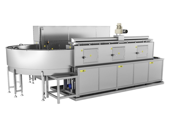 Maskinen kan byggas med en eller flera tankar beroende på valda processteg. Transportör i rostfri ståltråd ingår som standard, med alternativa bandtyper som tillval. PLC och HMI erbjuds som tillval beroende på systemnivå och automationsbehov.